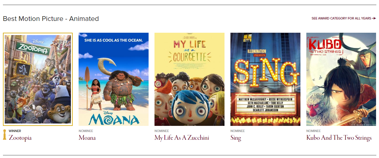 This year, there was some very stiff competition for the animated category, so Zootopia’s win wasn’t necessarily a guarantee.  The other nominees were Moana, Sing, Kubo and the Two Strings, and My Life as a Zucchini.  All of these are very good movies- especially Moana and Kubo.  In a year so full of quality animated movies, It’s amazing to see a film that was not initially expected to do so well triumph in yet another area!