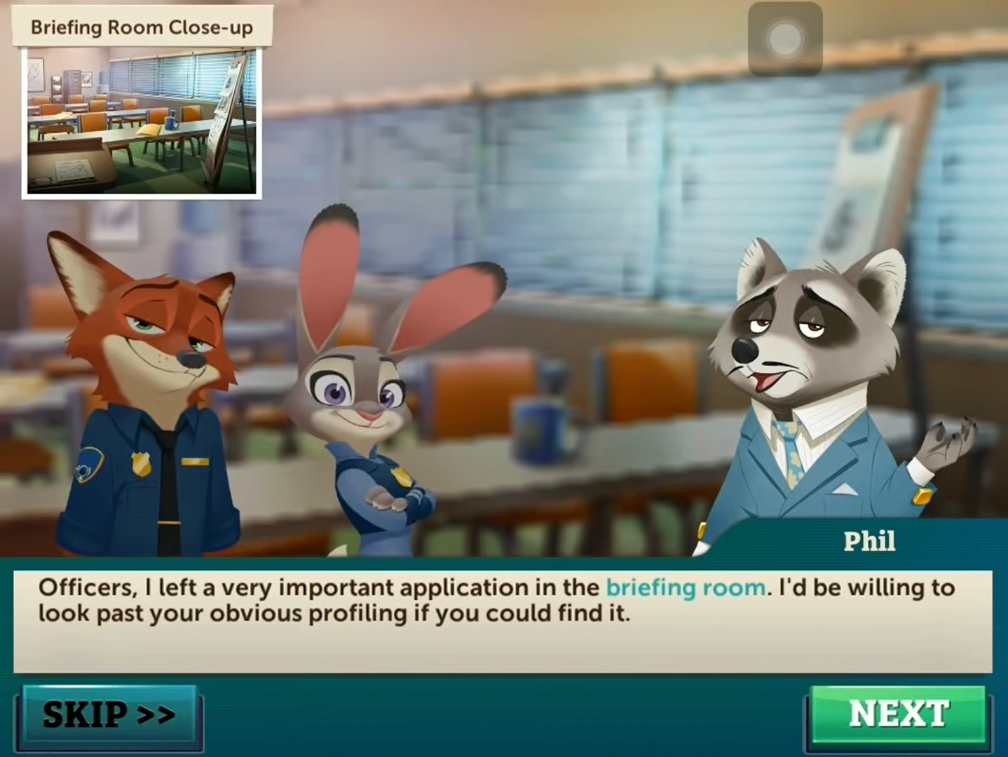 Nick and Judy will be given an assignment to find the guilty party of various cases by Chief Bogo. Every case has 9 crime scenes (with the exception of case 1 & 2 which only has 3 & 6 scenes respectfully.) For each of these scenes, you will be asked to find a list of objects but only one (or sometimes two) of these objects will help you progress the case.