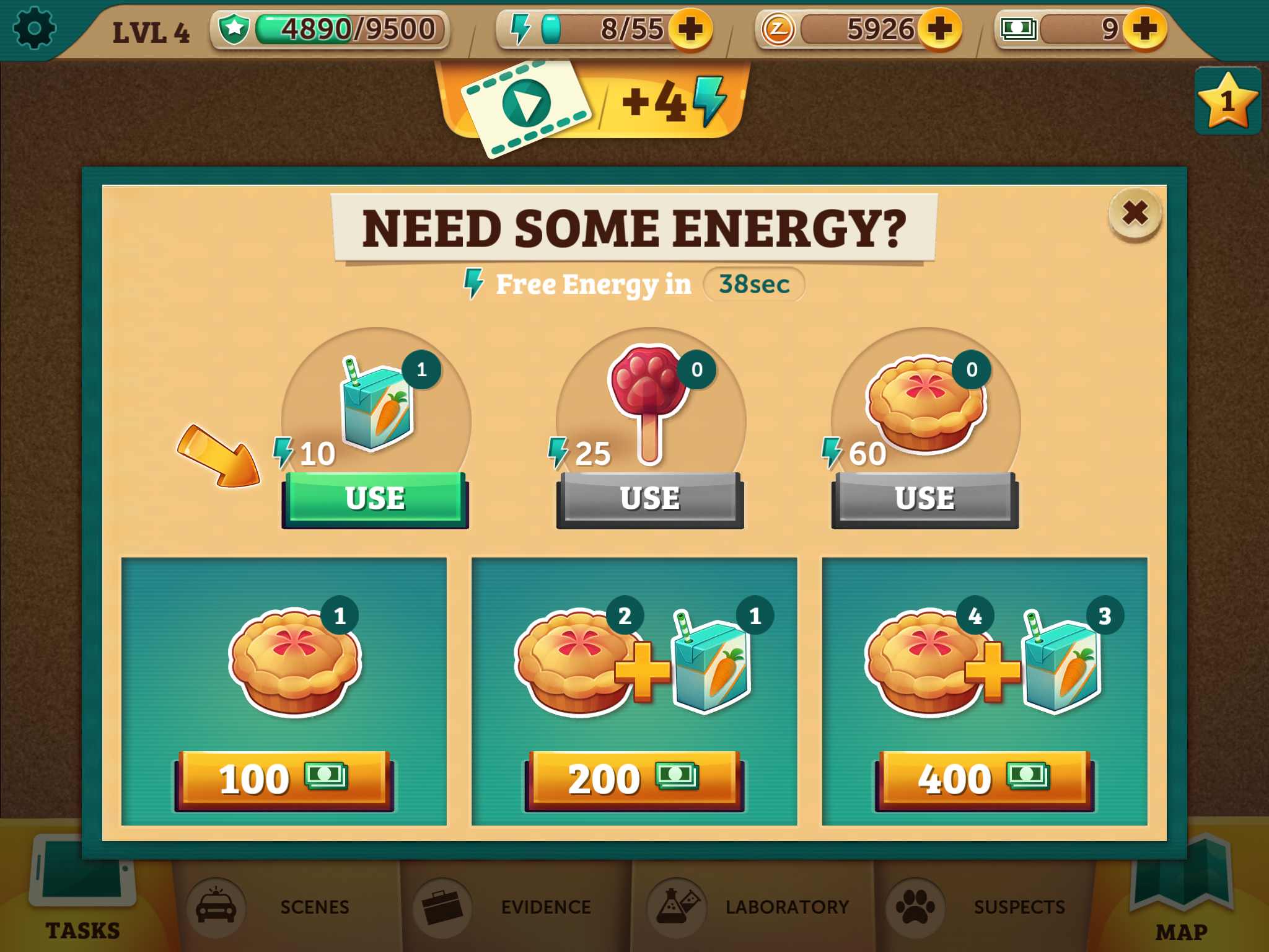 Surrika Protip: Gold medal the cases and buy as many pies as you can and only use the pies if you have to earn another star. If you are stuck at a timer you are wasting energy and valuable exp.