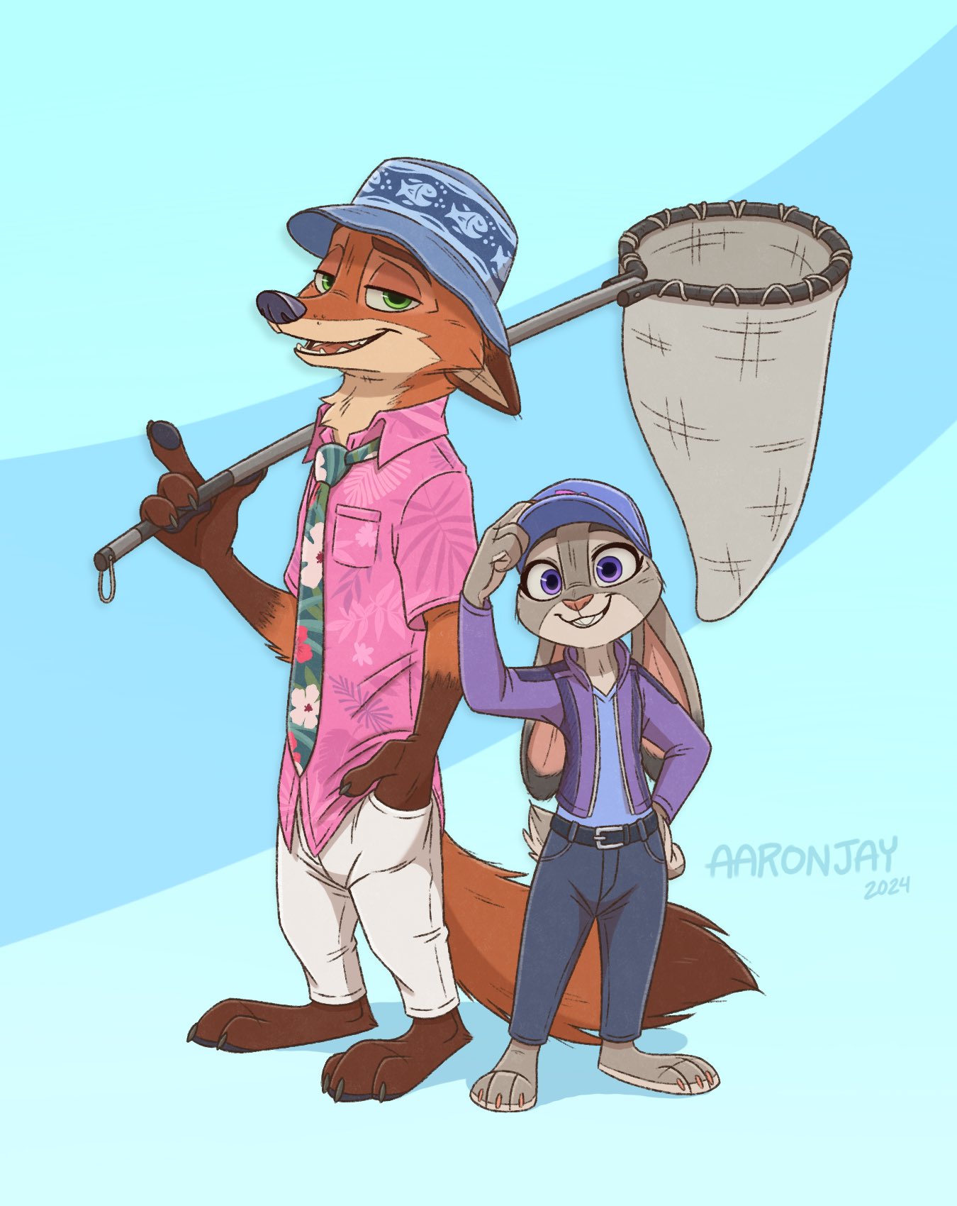 I also recommend that you (AaronJay) illustrate an image to add up Reddit or Devintart about Nick Wilde, Judy Hopps, Amelia Holmes and Henry Watson wearing their regular clothes, and then illustrate an image of them wearing their police uniforms and detective uniforms and then one with them all at the beach together wearing their swimsuits and swim trunks and lastly four depicting them as animal superheroes, first with Nick and Judy as The Ultimate Spider-Fox and The Amazing Spider-Bunny and Amelia as Wasp-Fox and Henry as the Ant-Bunny, (Nick’s superhero costume as The Ultimate Spider-Fox’s is identical to Spider-Man/Peter Parker’s but is designed to fit foxes like him instead of humans in terms of the mask shaped to fit a fox and not a human and the actual suit being fox sized and not human sized and Nick’s fox tail easily being fit in the costume via a pocket at the other end, while Judy’s superhero costume as The Amazing Spider-Bunny’s is identical to Silk/Cindy Moon’s but is designed to fit rabbits like her instead of humans, in terms of the actual suit being small enough for a bunny to fit in and a hole in the rear-end for her bunny tail to fit through, and also wears a pink bandana around her face only showing her rabbit ears and eyes and top head, but not her mouth and nose or lower face, and Amelia as The Wasp-Fox’s superhero costume as the Wasp-Fox is identical to The Wasp/Janet Van Dyme’s or The Wasp/Hope Van Dyme’s but is designed to fit foxes like her instead of humans in terms of the mask shaped go fit like a fox and not a human and the actual suit being small enough for a fox to fit in and Amelia’s tail easily being fit in the costume via a pocket on the other end, while Henry as the Ant-Fox’s superhero costume is identical to Ant-Man/Scott Lang’s but is designed to fit rabbits like him instead of humans in terms of the mask being designed to fit a rabbit and not a human’s with pockets existing on the top for Henry’s rabbit ears to fit through, and the actual costume being rabbit sized and not fox sized and there being a hole in the rear-end for Henry’s rabbit tail to fit through. Nick’s superhero costume also has web gliders on it, same for Judy’s.) then Nick and Judy again being The Ultimate Spider-Fox and The Amazing Spider-Fox and Amelia being the mutant superhero, Everything Fox and Henry being the Kryptonian superhero, Super-Bunny (Amelia as Everything Fox wears a superhero costume that consists of a red suit and pants, her superhero logo on the chest green, and yellow paw gloves and feet gloves, a yellow belt, a blue eye mask plus a blue superhero cape, and Henry as Super-Bunny wears a superhero costume related to Superman’s expect that it is small enough to fit an actual bunny like him and has a hole punched in the rear-end for his rabbit tale to fit through.) and Amelia and Henry again being Wasp-Fox and Ant-Fox and Nick and Judy being the Termite-Fox and Bee-Bunny (Nick’s superhero costume as The Termite-Fox looks identical to Ant-Man/Scott Lang’s but is more termite-like and is designed to fit a fox like him instead of a human with a mask designed to fit a fox and not a human and the actual suit being fox-sized and their being a pocket in the rear end for Nick’s fox tail to fit in. Judy’s superhero costume as the Bee-Bunny looks identical to Wasp/Hope Van Dyme’s but is more bee-like, and is designed to fit a Rabbit like her instead of a human with a mask designed to fit a bunny with pockets for her rabbit ears to fit in while the actual suit is bunny sized and there is a hole punched in the rear-end for her bunny tail to fit in.)