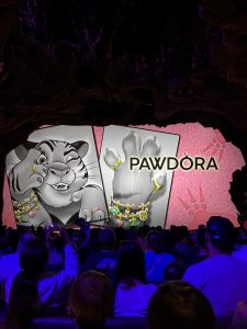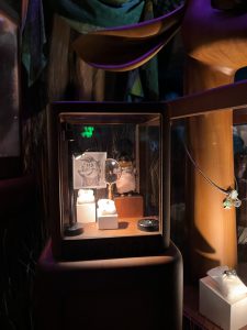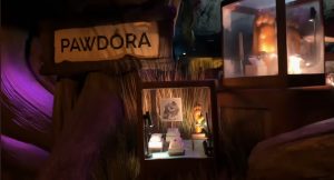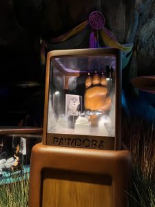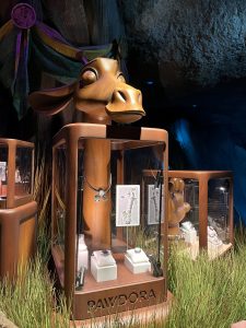 Across from the message board is a display of in-universe jewelry, “Pawdora”, a pun on the real life Pandora jewelry, a third-party jewelry store often seen in the Disney Parks and Disney Springs selling Disney themed jewelry and sponsors different Disney hosted events including firework spectaculars. There’s even frost around the case displaying the polar bear and a display showing jewelry for a giraffe which is too long to fit in the display.