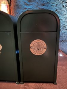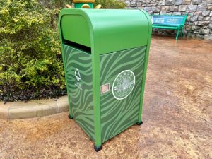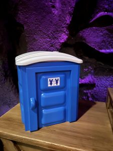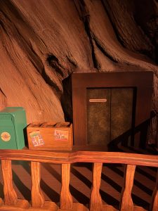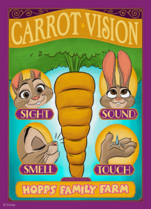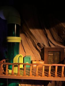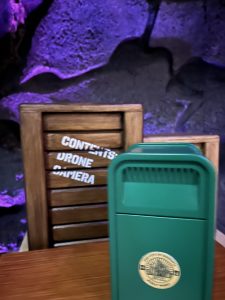 In different areas of the room, small items such as a mouse-sized porta-potty, boxes containing drone equipment and even a small balcony and small transport tubes for smaller rodents. On the miniature balcony, a glasses bin can be seen for the “Carrot•Vision” glasses and a small door for rodents to enter the theater. Even the trash cans resemble the trash cans seen in the Disney Parks. The same trash cans seen in Zootopia Land in Shanghai Disneyland minus the tiger stripe design.