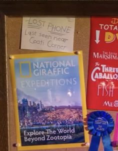 Starting at the top left corner, a note can be seen for a lost phone, a “National Giraffic” magazine (a reference to National Geographic) and a first place blue ribbon from the Carrot Days Festival in Bunny Burrows.