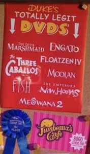 Next is Duke Weaselton’s “totally legit” DVDs with in-universe references to Zootopiafied Disney films such as The Little Mermaid (“The Little Marshmaid”), Encanto (“Engato”), The Three Caballeros (“The Three Caballos”), the in-production as of this post, Frozen IV (“Floatzen IV”), Mulan (“Moolan”), Wish (“Fish”), The Emperor’s New Groove (“The Emperor’s New Hooves”) and Moana 2 (“Meowana 2”). Just below Duke’s ad for more of his DVDs is an ad for a buy-one-get-one jumbo pop at Jumbeaux’s Cafe where Nick and Judy first met and where Nick got a jumbo pop to melt down to make pawpsicles.