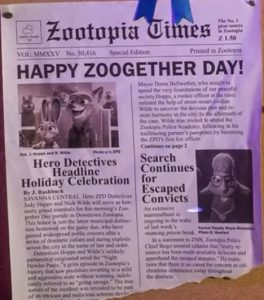 On the bottom left, there’s a Zootopia Times article that alludes to a side plot with our hero cops, now detectives, Nick Wilde and Judy Hopps now headlining the Zoogether Day celebration as grand marshals and Dawn Bellwether still at large as a prison escapee, marking the second Zootopia attraction she’s escaped ZPD’s jail.