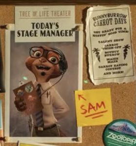A picture of the stage manager for the Zoogether Day broadcast, Sam from the Zootopia+ short, “Dinner Rush” who can be heard on the attraction’s intercom inviting Zootizens inside the theater. An ad for the Carrot Days festival can be seen next to Sam.
