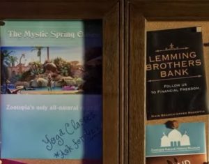 Ads for Mystic Springs Oasis with a note about Yax offering yoga classes as seen in the Zootopia+ short, “Hopp on Board” and the Lemming Brothers Bank with a “follow us” joke of course referring to how lemmings follow one another including when Nick sold them pawpsicles in the first film.