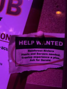 A help wanted ad from the Rainforest Rivera restaurant seen in the “Dinner Rush” episode of Zootopia+ where Sam either still works or used to work.