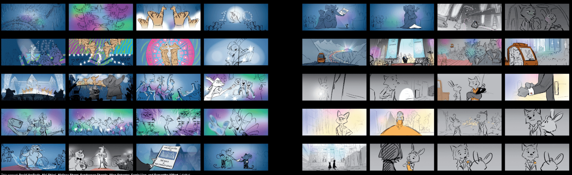 Carrie: “So the gala came early on, but it was early enough that it was not developed into this first version that was shown anywhere else. From early versions of the gala — and you can see, like, top right corner — originally Judy was invited to the gala as opposed to having to sneak in. So there’s more of an element of coming into this grand entrance. And, you know, for a bunny from Bunnyburrow, small town, we wanted to make it feel like a very special experience — like, ‘Oh, now she’s hanging out with this really glacial thing.’ So when we are figuring out the story, we’re still trying to figure out what we need visually. So there was always going to be this kind of VIP area you see in the far top right. The introduction of the Lynxlys. Again, Alan — one of our story artists — he did an amazing job creating this weird cat tower kind of construction where they were sitting high above and stuff. And there was always kind of a stage there. But this is early on when it’s like, we’re still figuring out where do we put all these elements. Once we started working with VizDev and getting some of their designs and more of a sense of what this would be, we would adjust the storyboards to reflect that. There was this sense like, ‘Oh, okay — if the Lynxlys, it’s going to be in Tundra Town somewhere, so it’s going to be more icy.’ So you see, like, ice sculptures, all that stuff — imagine what it could look like with snow falling. And just working with VizDev concurrently — the more they start to design, the more we try to incorporate it into the storyboards. At the bottom you see another piece that Alan did, which is like the interior room — you know, where Gary grabbed Milton — and that was based off of one of Lucy’s paintings, which you’ll see. So we got to… we were like, oh, the stage maybe is more centered to the room instead of, like, to one side. So it’s just showing that as the needs of the story change and as we get more information and design, we’ll adjust the storyboards.”