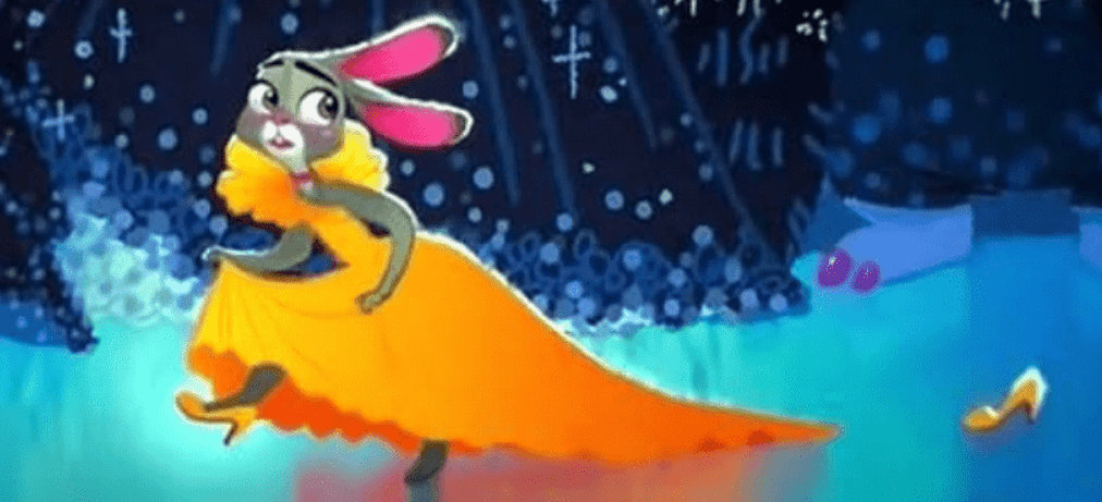 Gris: “Corey has always talked about the environment of the gala party to look like the Frozen 2 wrap party. That is the cyan and the magentas — and those are Frozen 2 wrap party. Yellow — we don’t… yellow… there’s no yellow in Frozen. So I thought one of the reasons is because it all… too much attention, but it’s perfect for this moment because we want to give that much attention to Judy, and also the volume — because she’s so little, the volume will help us spot Judy. And I also see a lot of storyboards — we all think at the same time with like, uh: make her dress big and goofy and pretty. And a funny story that I shared: production was like, ‘No, that’s going to be too complicated.’ They keep making the dress, you know, less poofy. And then the story artists make it more poofy. But Sam always put it like… I don’t know, like Marie Antoinette.”