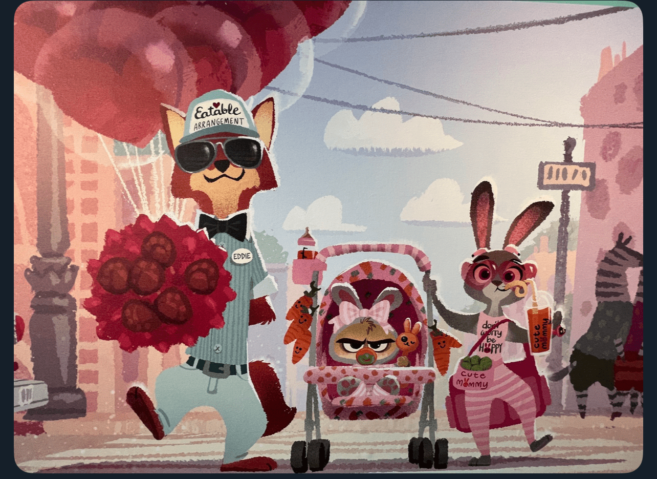 Carrie: “Yeah, it was really lovely. I knew one of the things we wanted to talk about was our favorite pieces, and this is a piece that, like, I just… I don’t know if you see it anywhere else, but it was kind of made early in the process. We have something early in the process of making a movie where we kind of want to show artwork to marketers and other divisions, so we want pieces that encapsulate what we’re about. Very early on, the meaning of this might be a story where Nick and Judy have to go on the run. So obviously, this scene doesn’t exist in the movie. This is one of the early images — like we showed before — kind of like someone is moving. And he’s amazing — so good.”