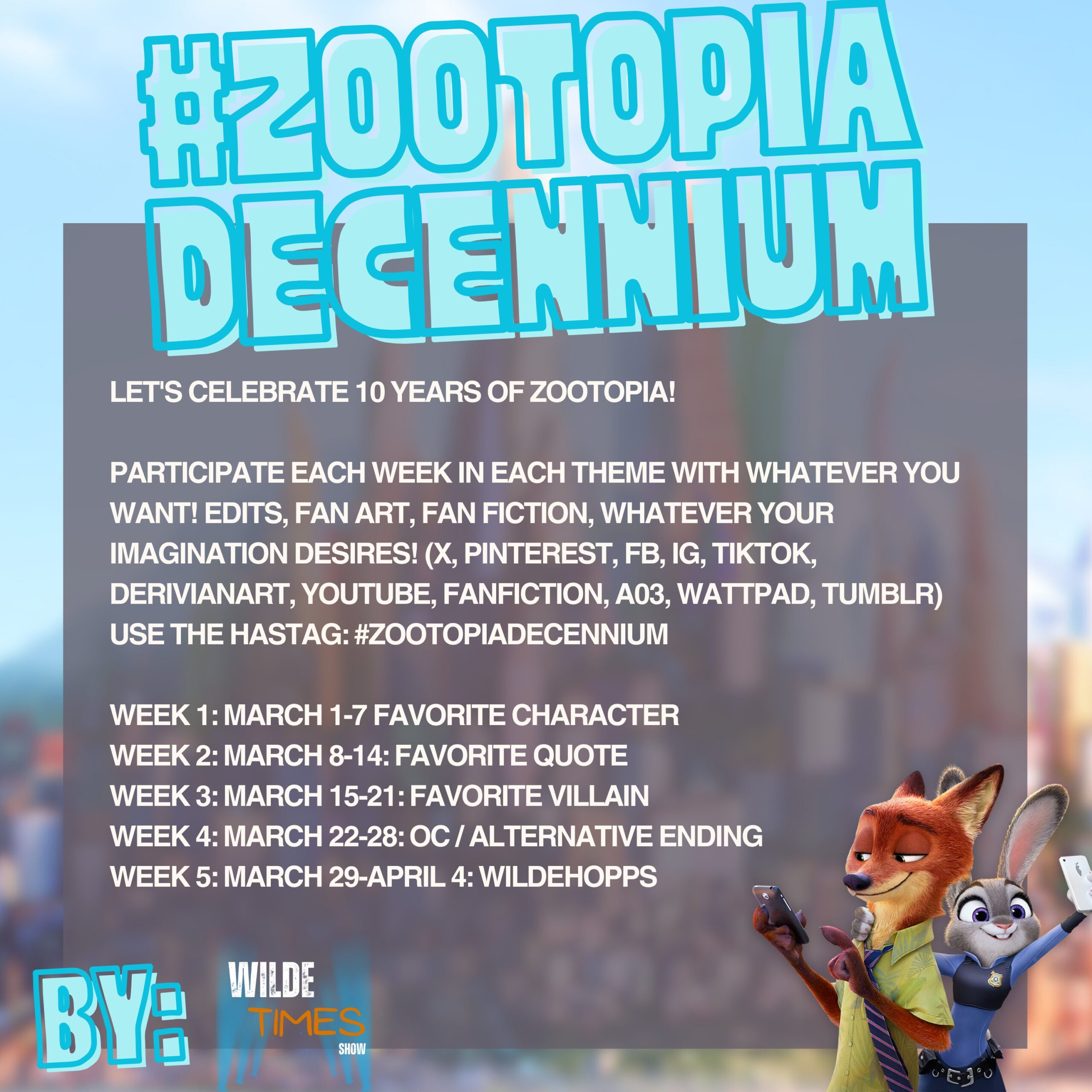 Participa cada semana en cada temática con lo que tú quieras!! Edits, fan arts, fanfics, lo que tu imaginación QUIERA!!#zootopiadecennium #zootopia2 #Wildehopps pic.twitter.com/OSkwWutZ26